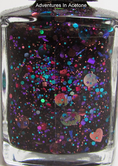 PURP... Excuse Me!! is such a funny name for a polish! It is a black jelly polish filled with tons of different colored and shaped glitters, a lot that are holographic. I chose to wear it on it's own to show how it can build up at 3 coats. There were so many glitters at three coats that I think I prefer the way Michelle from Things I Love At The Moment layered one coat over a black base. The glitters pop more with the darker base. But here are my photos with three coats and one coat of top coat.