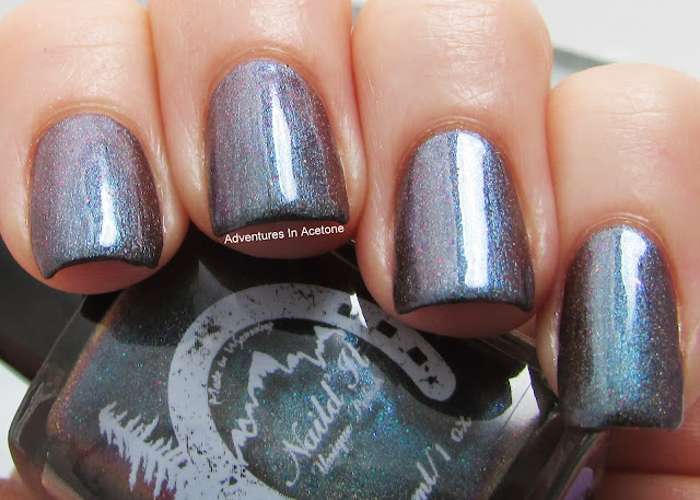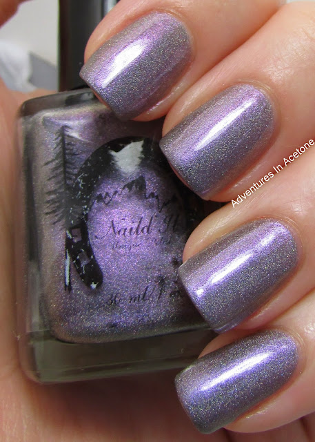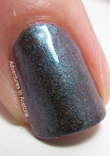 Next up is Abyss Kiss! It is so delicate and pretty! Abyss Kiss is described by Andrea as, "a multichrome color shifting holo polish with a green to purple to gray shift." I never saw the green but I did see pink, purple, and gray! It was more sheer than Bull Shift so I'm showing three coats below with top coat. Again, some photos are in the light box and some directly under the lamp.