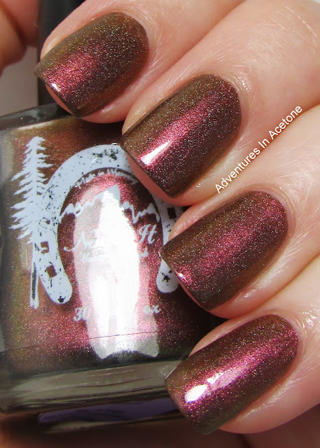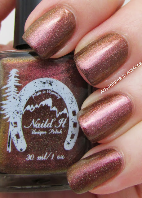I'll start out with my favorite of the three, Bull Shift! Bull Shift is described by Andrea as, "a multichrome holograhpic polish with a red, burgundy, copper, green shift." The color shift in this one was AMAZING! I only needed two easy coats with top coat for the photos below. Some pictures are taken in my light box and some directly under my lamp.