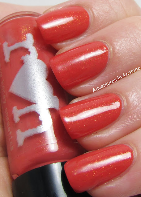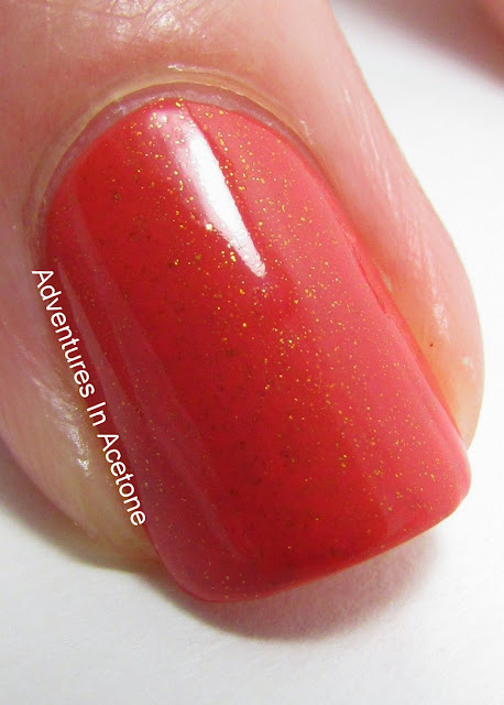 Schrammi is a deep coral lacquer with a golden shimmer. I'm showing two easy coats below with no top coat. I love this color! The golden shimmer is gorgeous! No issues to report.