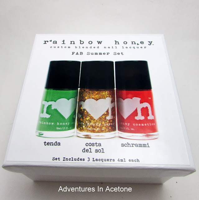 Good morning, readers! I have a fun set of Rainbow Honey polishes to share with you today! This is the FAB Summer Set! Here is what FAB and Rainbow Honey have to say about it: