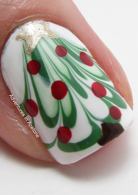Are you ready for my second festive nail art mani? This Christmas tree watermarble took me a zillion tries and redos and it ended up way different than I was envisioning but I like how it turned out. Of course, I had to add some presents :)