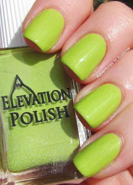 I got the Axe: Ice axe that is. Based on my favorite pair of ice axes, the polish is sort of a mix between green melon and lime. It looks like a solid color indoors but brightens and twinkles outdoors. Direct sunlight lets the sparse holographic pigment and soft shimmer really shine.