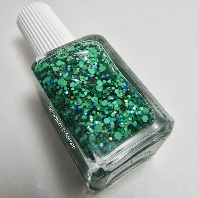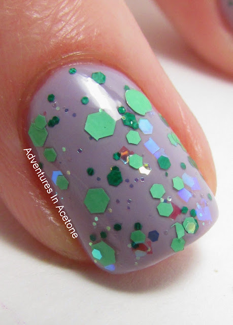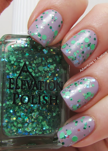 Next up is Finding Nemo. Is is a clear based glitter topper with iridescent glitters and green matte glitters in different shapes and sizes. I've paired it with Elevation Polish Tavan Bogd for a nice contrast of colors. I'm showing one easy coat with top coat below. The glitters came out of the bottle easily on the brush and spread nicely with no issues.