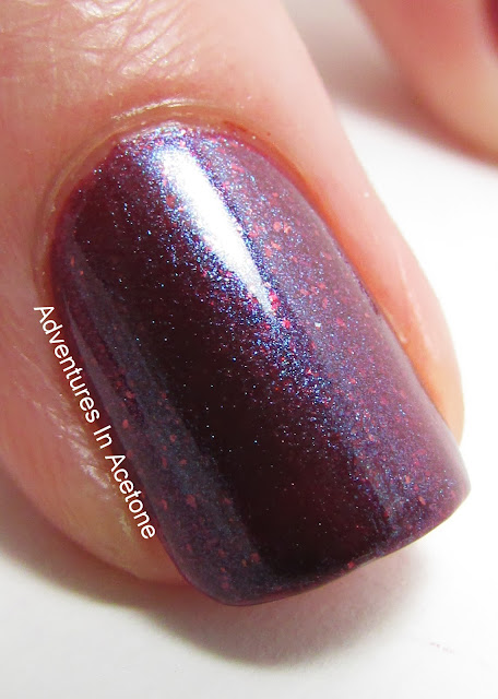 Our final color is These boots were... the color is hard to describe but it is a red/purple with a blue shimmer shift and flakes that are red/gold/pink. I am showing 2-3 coats below with top coat. There were a few lighter patches at 2 coats on some nails so some needed three coats. It applied very easily.