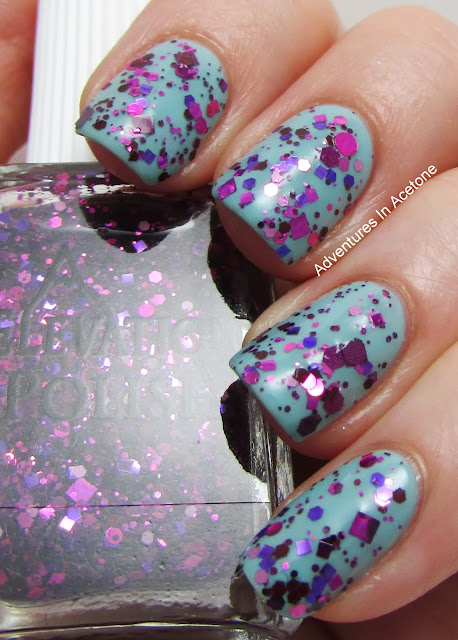 Pata Puffer II is a clear based glitter topper with fuchsia, pink, and purple in various shapes. I've paired it with Elevation Polish Jengish Chokusu to really show off the different colors. I'm showing one easy coat with top coat below. The glitters spread nicely and I didn't have to fish any out of the bottle.