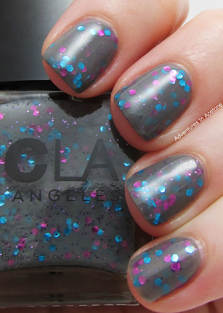 Sugar Fix is a gray jelly with blue and fuchsia glitters in two sizes. This is packed with glitter! I used three coats and let each coat dry in between so the next coat wouldn't drag off the glitter. Tons of glitter came out on the brush and it built up easily. Two coats were enough for some nails but I added a third to get rid of some lighter patches. It dried very textured where the glitters were so I recommend a thick top coat. I'm showing two coats of top coat for that shiny finish. I love this combination of colors!