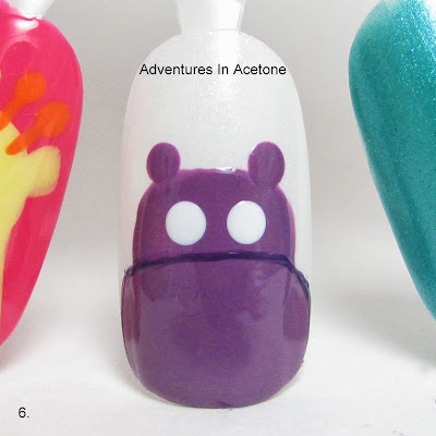 Step 6) Take the big dotting tool and China Glaze White On White to make two eye dots.