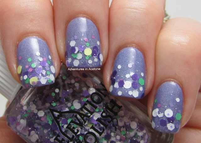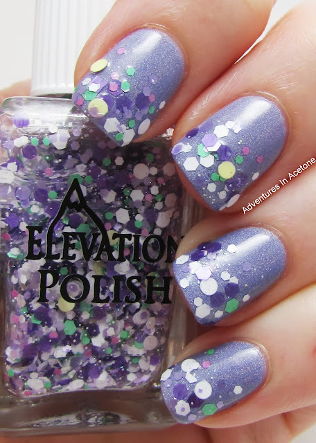 Passion Flower is a glitter topper in a clear base. It has tons of different colors and shapes of glitter including white, pink, purple, green, yellow, and iridescent. It's a really fun pairing and looks awesome over Echinops. Since I already showed you what one coat looks like in my last post, I chose to do a glitter tip gradient with Passion Flower. Topped with one coat of top coat.