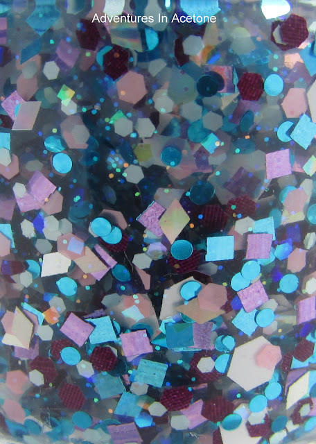 Elixiversary is a multishaped and multicolored glitter topper in a clear base. There are a ton of different shapes, and I am seeing white, blue, purple, pink, silver holo, and iridescent micro glitter! I think it would look great over a lot of colors and I chose to layer it over Illamasqua Noble. The blue squares and circles kind of blend into the base color at a distance, though, so maybe next time I'll try it over a color not so close to one of the glitters.