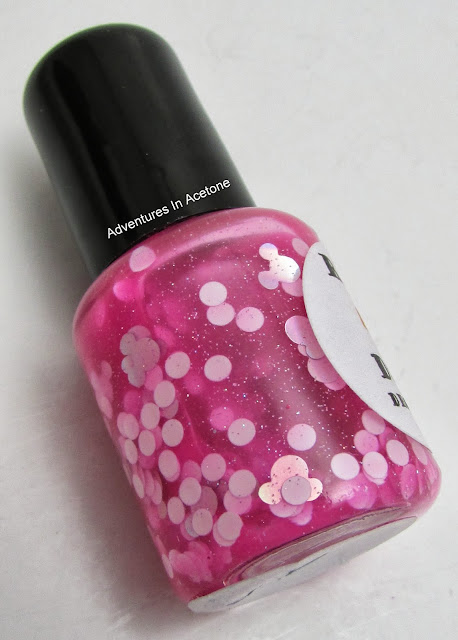 The final polish of The Mouse Collection is called Minnie's Party Dress! It is described as "mouse shaped silver holo glitters, mixed with white dots and micro holo glitter in a hot pink jelly base." Both the dots and mickey shaped glitters are heavy in this polish so I recommend turning the bottle upside down before application like I said in the beginning of this post. I love how simple this polish is! I tried to do an accent nail of the pink and white polka dot dress that I've seen in pictures on Minnie! (I also can't find a close up shot of the dress nail either, so I guess I forgot LOL).