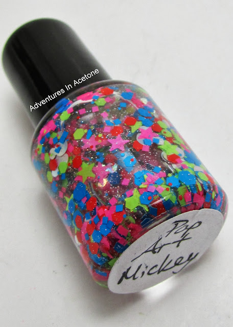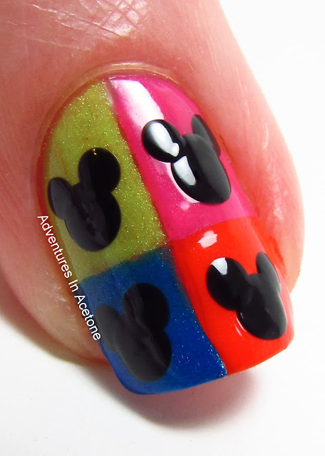The final Mickey inspired polish is called Pop Art Mickey. It is described as "mouse shaped silver holo glitters, mixed with neon pink and neon green stars, and various sized hex and square glitters in neon pink, neon green, neon blue and red, sprinkled with micro holo glitter in a clear base." I've layered two coats over a plain black creme with top coat. I love how it made the neons pop and the holo glitter sparkle. I've paired it with some simple pop art inspired nail art as well in coordinating colors.
