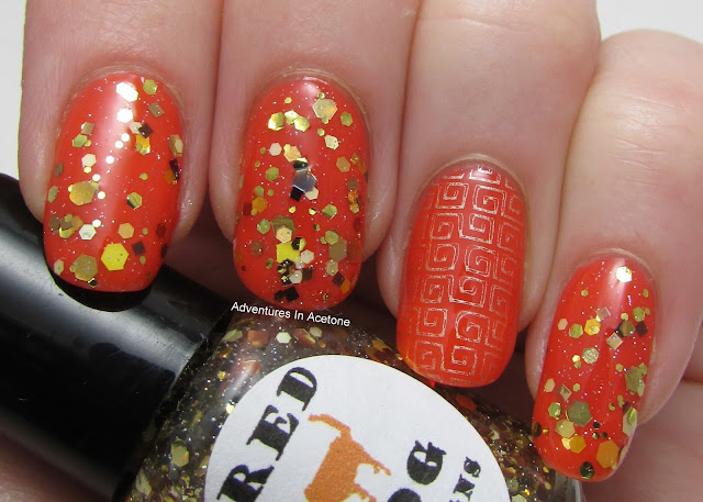 I layered one coat over this deep orange, with top coat. My accent nail is a stamp image (I think its from the new Bundle Monster set) that sort of looked like a maze, right? Corn Maze is a really pretty fall glitter and would look good over a ton of base colors. No issues to report.