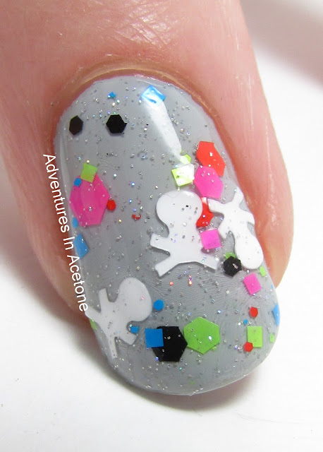 I'm showing one coat over a gray creme, with top coat and paired with an Incoco nail strip that I've colored in using jelly polishes. Dead Man's Party applied easily and I love the skulls paired with the bright glitters!