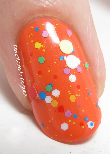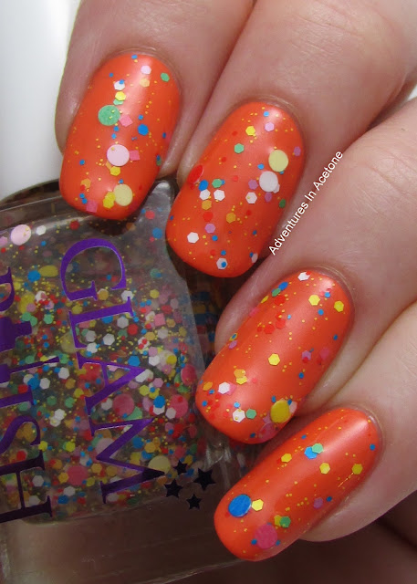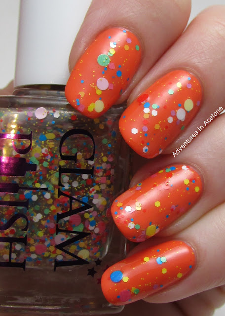 Lastly, we have Insane Clown Poppy, from the Sideshow Alley Trio. It is a clear based topper with a rainbow mix of dots, small hexes and squares. I'm showing one coat over Zoya Thandie with top coat.