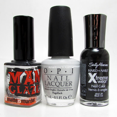Manglaze Matte Is Murder, OPI My Boyfriend Scales Walls, Sally Hansen Black Out.