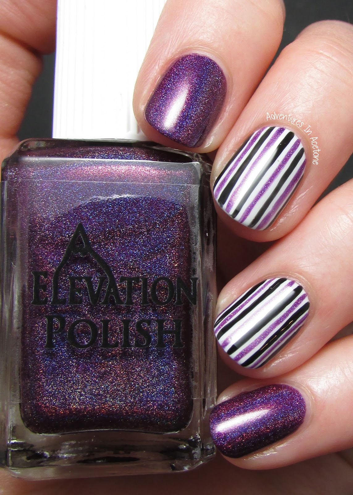 This is two coats with top coat and it's one of my favorite Elevation Polishes to date! The color is fabulous and the holo is a beautiful addition! I've done simple stripes on my accent nails.
