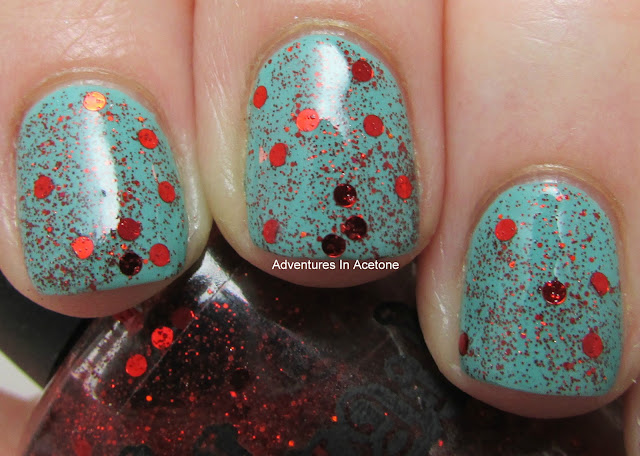 Today, we have the second glitter topper from the new Dandy Nails collection: Just Hugs. Sandy describes it as, "red dots, micro, and just a hint of holographic glitter in a clear base. " CIRCLE GLITTERS! I just absolutely love circle glitters, they seem to be coming out more lately and that makes me super happy. It's like instant polka dots! I had no issues with applying Just Hugs and am showing only ONE coat below! Shown with top coat over Ulta Mint Condition.