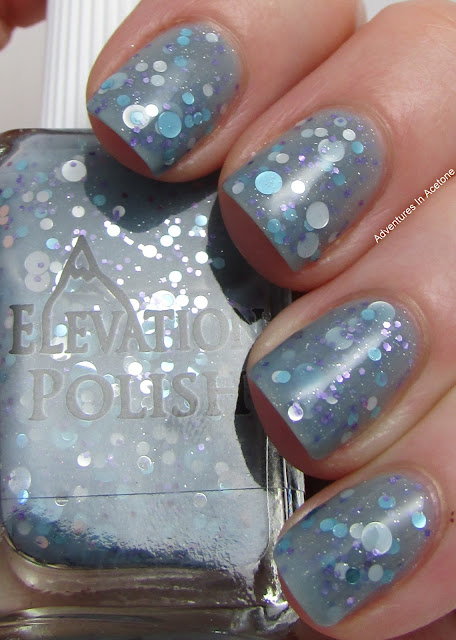 Marmolada has a dusty blue jelly base with light blue & silver circle glitter in 2 sizes, silver micro glitter & lavender hexes. It is so gorgeous and may be my favorite Elevation Polish! I'm showing three coats on it's own with top coat below.