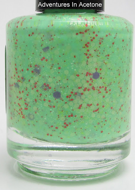 The final of the pastel crellies is Mountain Fizzle Doo. It's representative of Mountain Dew soda! "This polish represents one of my favorite drinks...Mountain Dew! My favorite thing about Mt. Dew is the fizz!!! So here is a pale neon green crelly (leaning more to creme) polish full of fizzle and fun! Pale green, pastel green, hot pink and purple glitters found throughout" This will need more than one coat of my thin top coat, as you can still see some texture in the pictures.