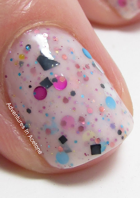 The other white based polish is called Sir Round Sound. "This is a white crelly with round glitters in fuschia, blue, yellow/goldish, pink, black(big) and silver holo (big) with a splattering of larger and smaller glitters (hexes, squares...)!"
