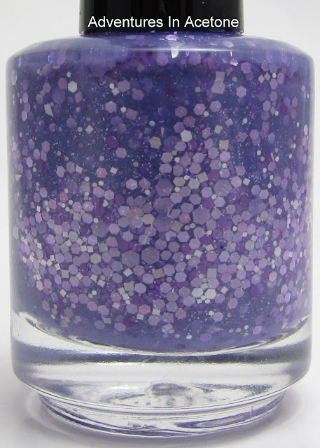 There is a second purple based glitter polish in this collection, although it is very different from Aurora's Grape Escape. This one is called Bad Hare Day. It's a purple shimmery jelly base PACKED with different colored and sized purple glitters. There are so many glitters, that I almost felt like it needed more base to apply easily and less glitter. Very pretty, though. It's also less blue toned than my pictures are showing.