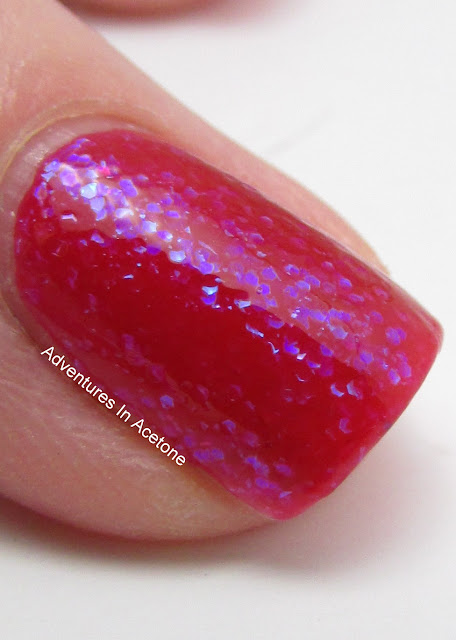 The blue iridescent glitters look pink and purple in this color base. I love the pinker tone it gives the orange. It made it much more wearable for me!
