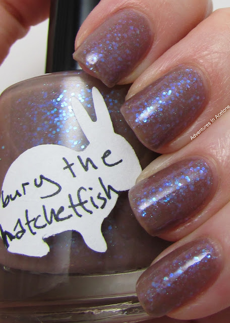 Finally, we have Bury The Hatchetfish. Clever name! It was inspired by the Hatchetfish and is a really interesting color combination. It's a tan (or even more taupe on me) jelly base with glowing blue iridescent glitters and glass flecks. I love that it is a neutral color with bright glowing glitters! I chose to wear 3 coats below with 2 coats of Poshe top coat.