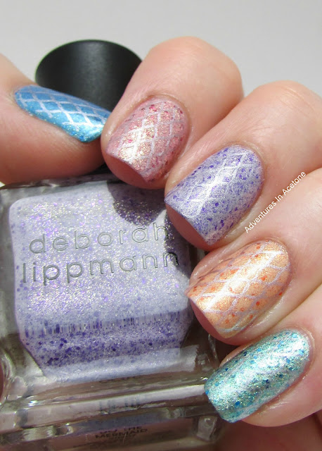 Hello, readers! If you saw the post I did last night of the new Deborah Lippmann Mermaids, you may remember me saying that I would be wearing all 5 colors in a skittle nail design today. The colors look too pretty together and I decided to add a delicate "mermaid tail" stamp over them. I love how it turned out! It was barely visible in the photos on Mermaid's Dream (pinky) but it was supposed to be subtle and not take away from the gorgeous polishes so I'm okay with that!