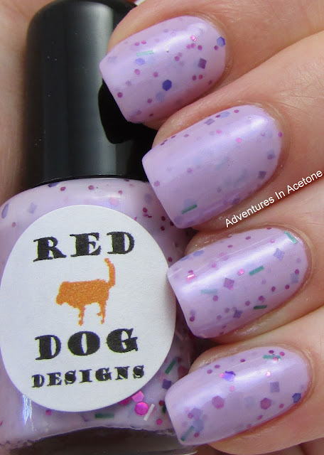 Raspberry Tart is next! It is a lavender base with a violet shimmer, and a mix of various hues of purple, berry, fuchsia, white and green in hexes, squares, micro slices, and circle glitters. I'm showing 2 coats below with top coat. No issues to report!