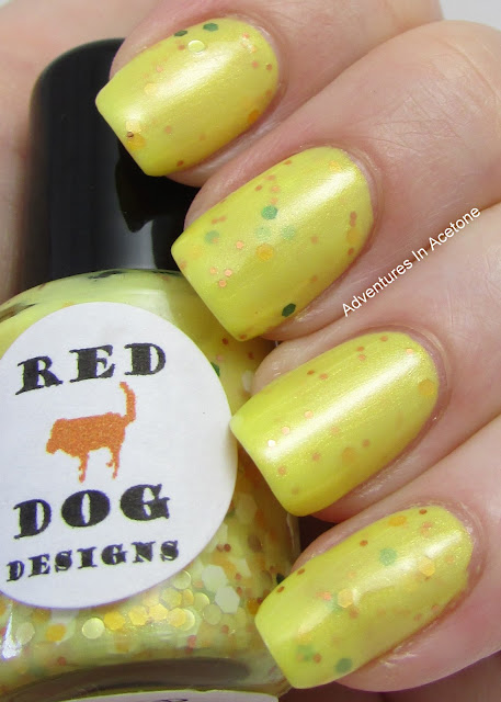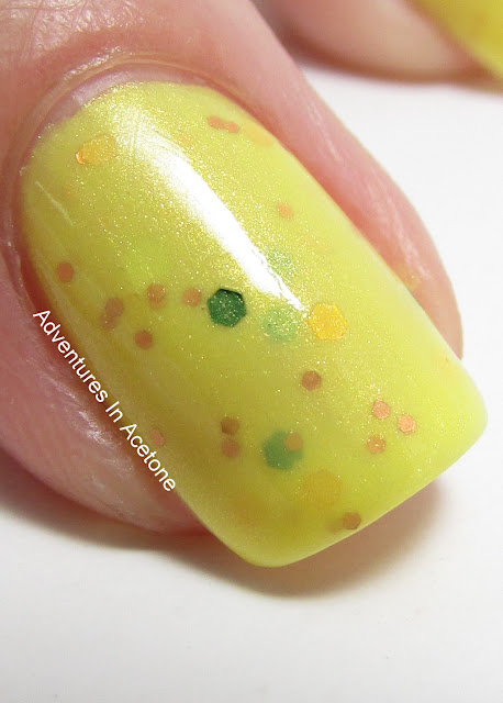 Next, we have Lemon Meringue. It is a yellow base with gold shimmer, and a mix of yellow, gold, white, copper and green in hex and circle glitter. I'm not a huge yellow fan but I really like this polish! I only needed two coats for full coverage and that's what I am showing below with top coat.