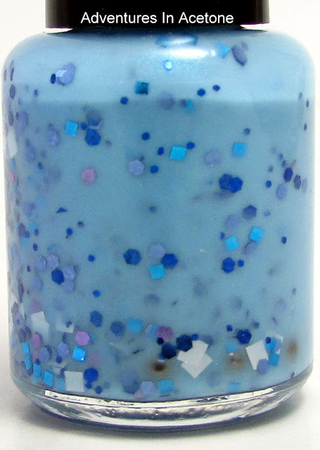 Blueberry Muffin is a favorite of mine from this collection! It is a blue base with a turquoise shimmer, and a mix of various hues of blue, periwinkle, white and purple in hex and square glitters. This is the only polish that I used 3 coats on but it is gorgeous! I love the shimmer! Shown with top coat.