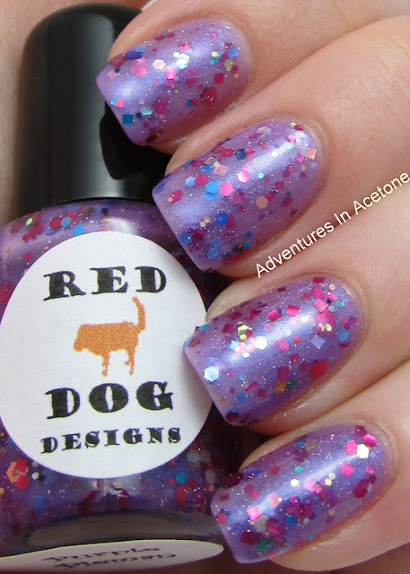 Lastly, we have Purple Pieman. It is the only jelly based polish of the collection. It has a purple jelly base with a blue shimmer, and a mix of microfine holo, berry, blue, and a rainbow of colors in hex and square glitters. I'm showing two coats with top coat but could have done three if I wanted a deeper base color. No issues to report!