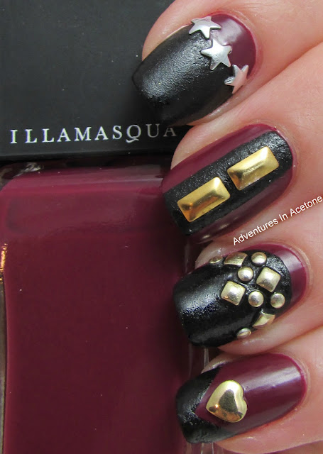 And here is my mani to show off 4 different looks using the studs! I used Illamasqua Vice (dries to a rubber finish) and Nails Inc Leather Effect in NoHo to tie in the stud look.
